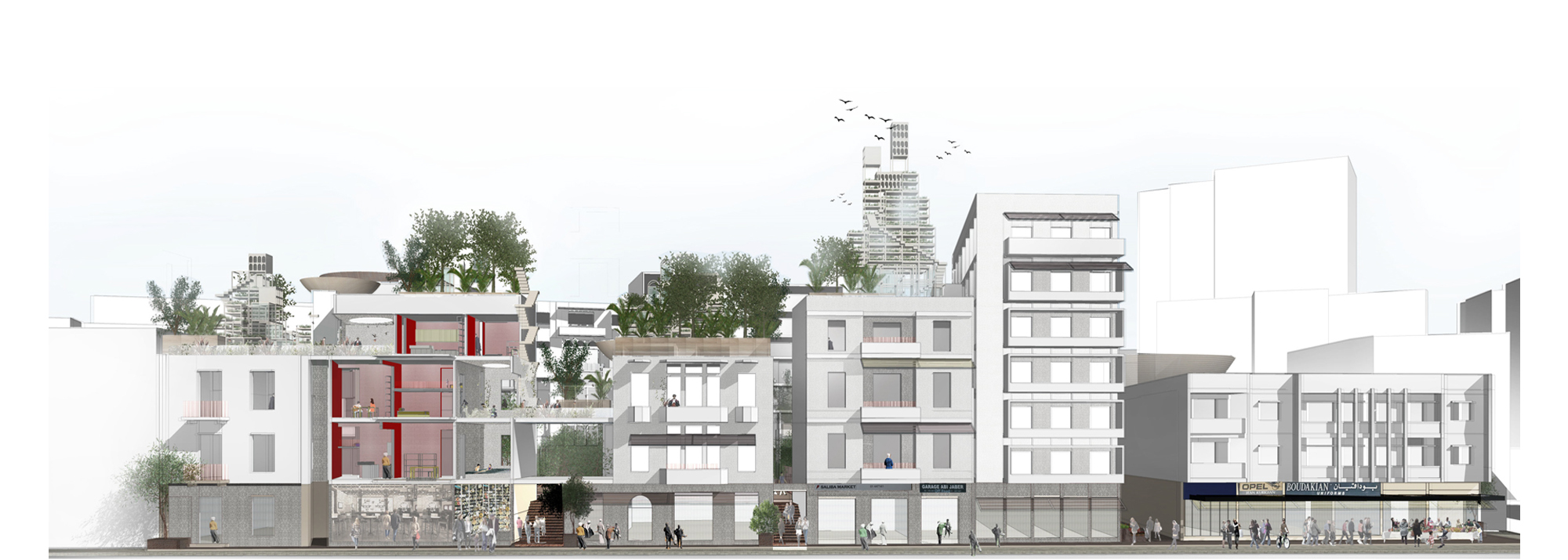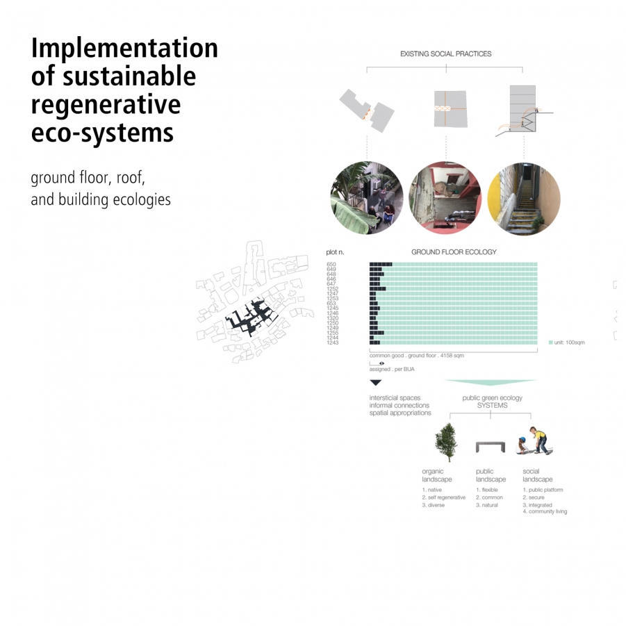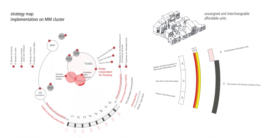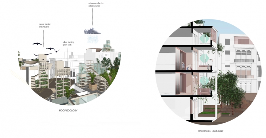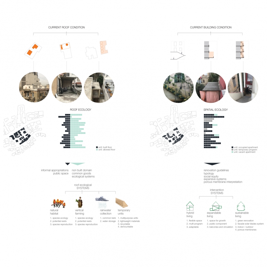 The proposal aims at fostering a culture of inhabiting the environment rather than setting parameters and building frameworks within which perceptions of housing are confined. By encouraging communal strategies towards the degrowth of the city and by engaging existing governmental forums to participate at the scale of its neighborhoods, we believe that a healthy ecology of living would be made sustainable within the diverse citizenship of Beirut. With the increase in affordable housing units across the city, and an assimilation of those units within the existing fabric (as opposed to their segregation within designated zones), we would pave the road towards a socially conscious transformation aimed at engaging the city housing ecologies as a shared urban resource.