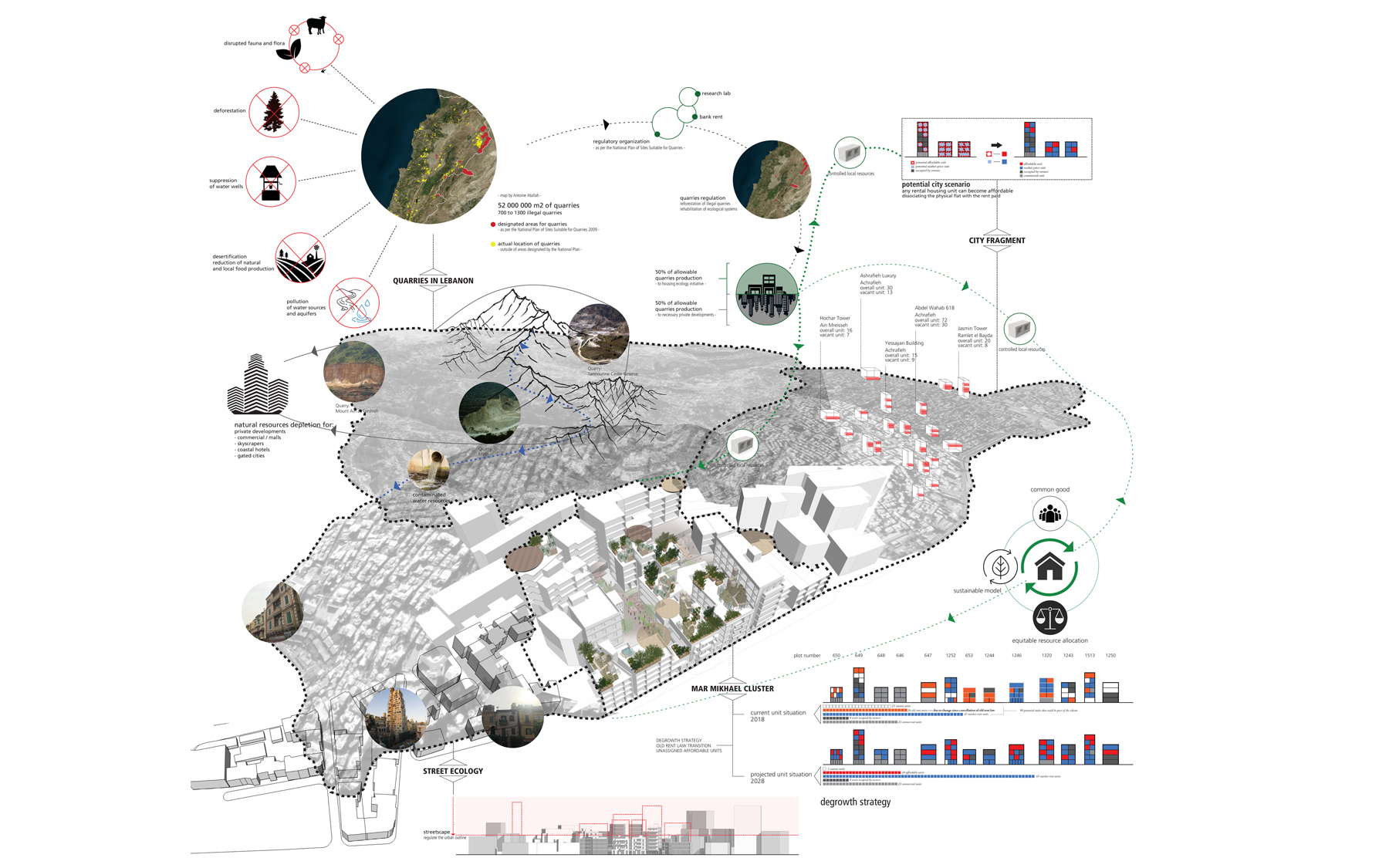 What we propose aims not to function as a complete narrative for Beirut's de-growth, but rather as a socio-spatial imaginary of a city which no longer blindly follows a culture and model of economic growth that has operated more as an amplifier of spatial and social injustices than a means to mitigate them.