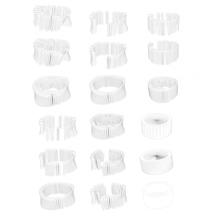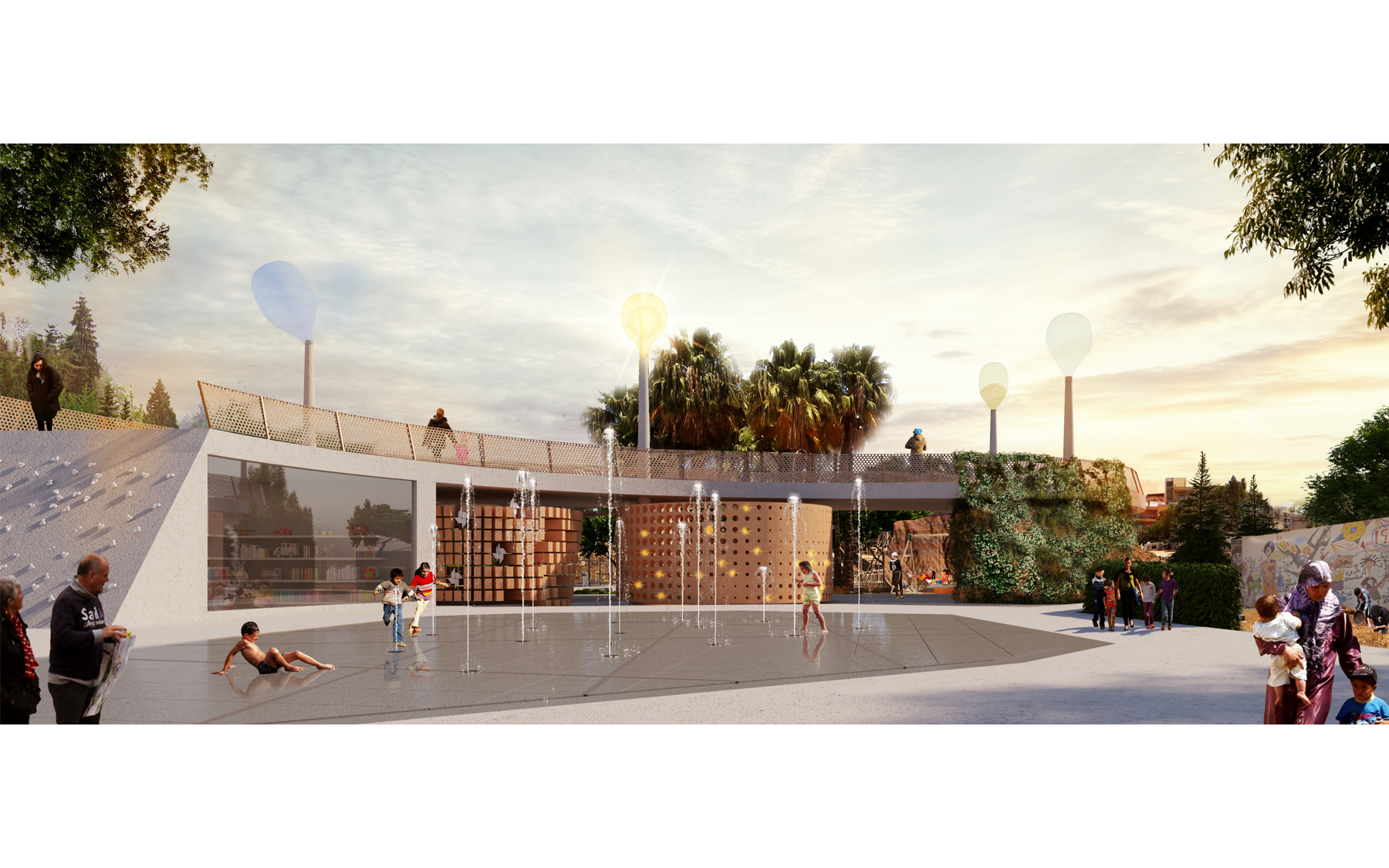 The Light Ecosystem is characterized by a rammed earth wall perforated to infiltrate and diffuse different lights throughout the day and lit at night using the energy saved from the kids cycling. The totem will also be lit indicating the energy saving during the opening hours of the park.