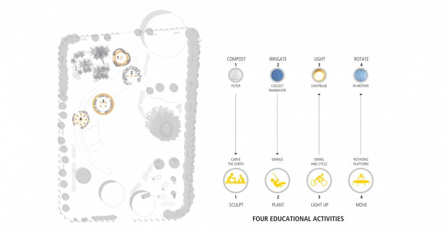 The first step towards the appropriation of the four Ecosystems by the community would be to involve the locals in the process of the making rather than delivering a ready-made product they might feel alienated towards. It is a participatory approach with an educational edge converting the landscape for children into a soothing haven for them to experiment with a whole array of different transformations from playful elements to productive energies.