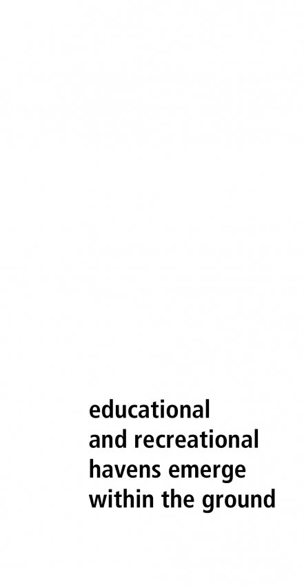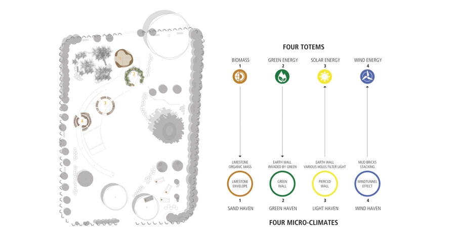 While being aware of the need to be more environmentally sensitive, our four interventions propose a concept that incorporates earth structures, energy efficiency, raw and local materials, vegetation and natural greenery coupled with educational tools and games for the kids to get them better acquainted with their environment and the importance of protecting it. The perfect combination between ecology and human interventions and activities is key to the sustainability of the project. The notion of sustainability grows beyond the activation of the four totems on top of the poles. The spaces are all made of one material, earth, but are built following different construction techniques. The earth structures and the different spatial qualities they propose will create environmental awareness and understanding.