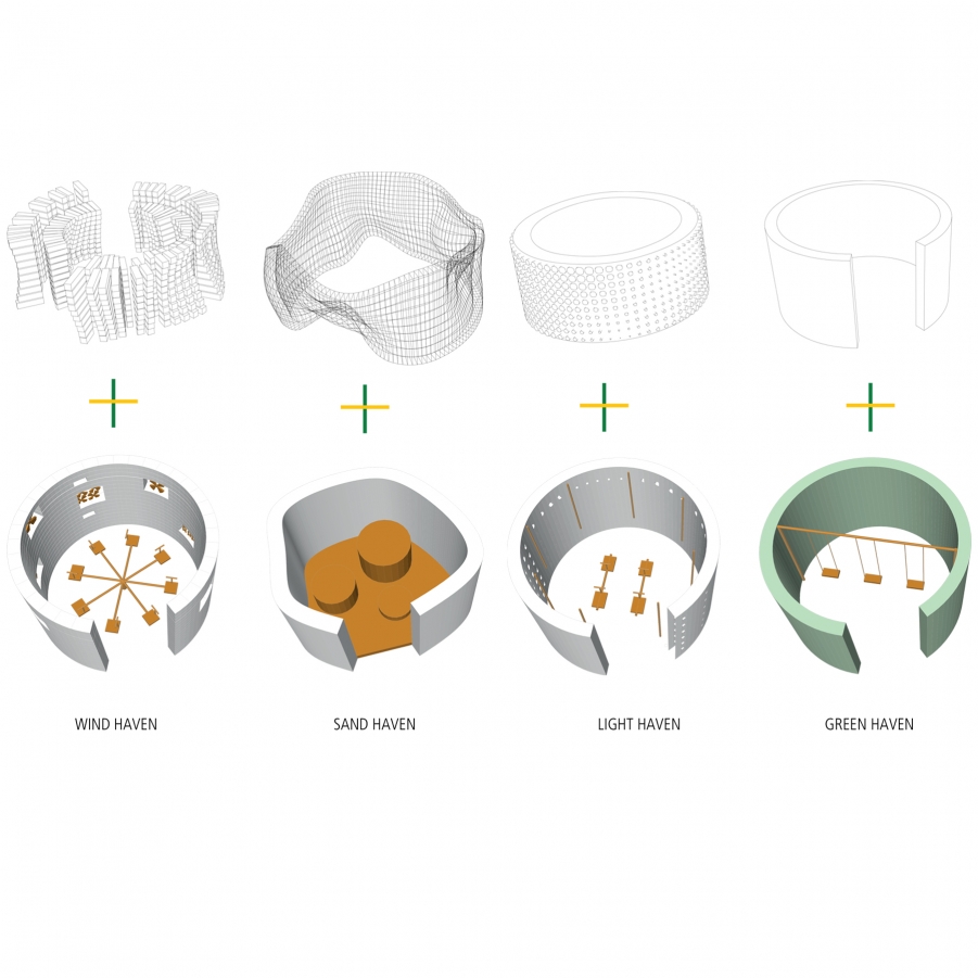 Inspired by the existing microclimate under the palm trees and abstracting pleasant and/or familiar existing conditions in the city, we are proposing to implement four havens: The Wind, the Light, the Sand and the Green. The intervention focuses on engaging the local community in the making of the ecosystem, the maintenance of it and its dissemination in the Karantina Park and beyond.